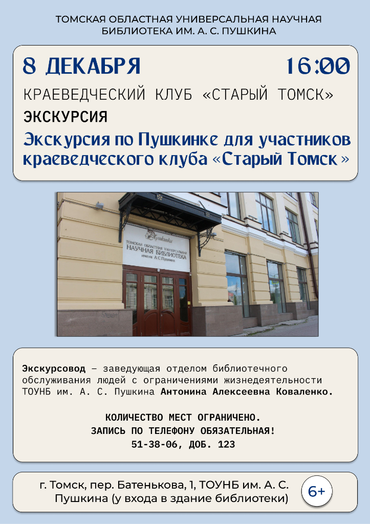 Антонина Алексеевна Коваленко – заведующая отделом библиотечного обслуживания людей с ограничениями жизнедеятельности ТОУНБ им. А. С. Пушкина проведет экскурсию по отделу для участников краеведческого клуба «Старый Томск».