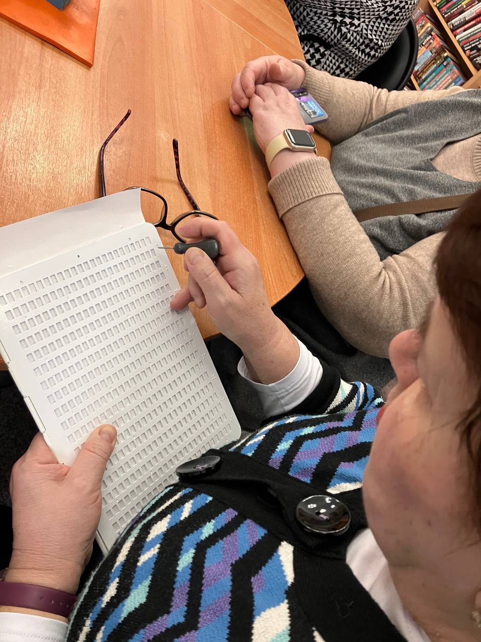 Члены клуба узнали о рельефно-графических альбомах и «говорящих» книгах. Для слабовидящих есть книги с укрупненным шрифтом. Особый интерес представляет альбом «Прогулки по городу Томску», в котором использованы обычный текст, шрифт Брайля, фотографии зданий. Интересна также эволюция развития носителей информации для «говорящих» книг. Сначала были магнитофонные ленты и кассеты, затем DVD-диски, а сейчас большим спросом у читателей пользуются говорящие книги на флеш-картах, которые можно воспроизводить с помощью тифлофлешплеера.